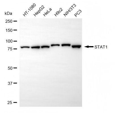 • Western blotting analysis using STAT1 antibody. Total cell lysates (30 μg) from various cell lines were loaded and separated by SDS-PAGE. The blot was incubated with STAT1 antibody and HRP-conjugated goat anti-rabbit secondary antibody respectively.