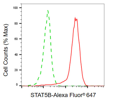 • Flow cytometric analysis of STAT5B expression in HepG2 cells using STAT5B antibody. Green, isotype control; red, STAT5B.