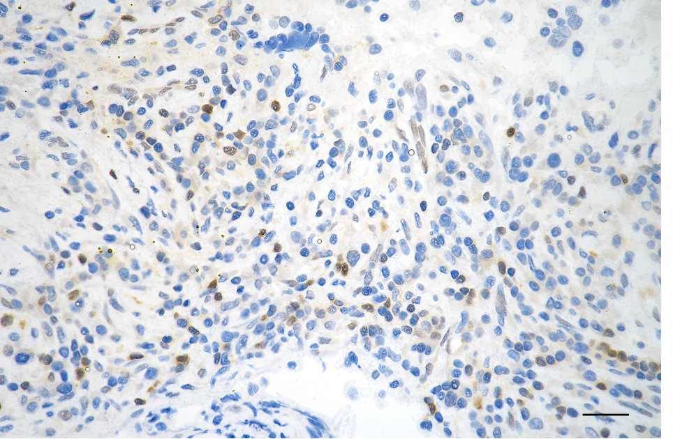 • Immunohistochemistry was performed on paraffin-embedded human breast carcinoma using STAT5B antibody. Antigen retrieval was done in sodium citrate buffer (pH 6.0). DAB was used for detection, with hematoxylin counterstaining. Images were acquired using a Nikon Ci-L Plus microscope (40× objective). Scale bar: 25 μm.