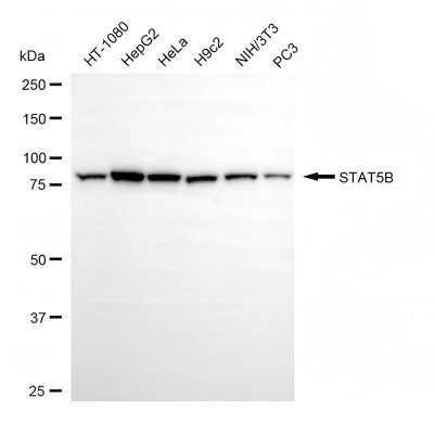 • Western blotting analysis using STAT5B antibody. Total cell lysates (30 μg) from various cell lines were loaded and separated by SDS-PAGE. The blot was incubated with STAT5B antibody and HRP-conjugated goat anti-rabbit secondary antibody respectively.