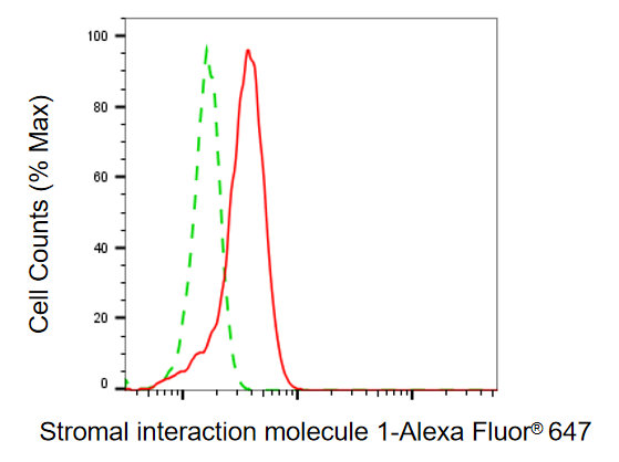 Flow cytometric analysis of stromal interaction molecule 1 expression in HeLa cells using stromal interaction molecule 1 antibody. Green, isotype control; red, stromal interaction molecule 1.