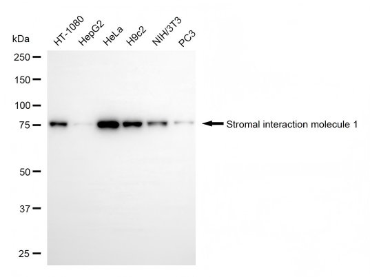 Western blotting analysis using stromal interaction molecule 1 antibody. Total cell lysates (30 μg) from various cell lines were loaded and separated by SDS-PAGE. The blot was incubated with stromal interaction molecule 1 antibody and HRP-conjugated goat anti-rabbit secondary antibody respectively.