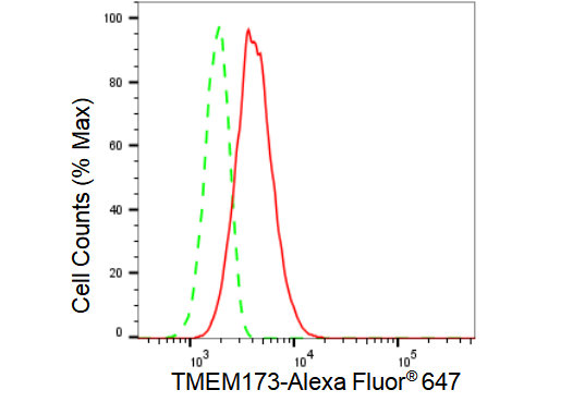 Flow cytometric analysis of TMEM173 expression in HT-1080 cells using TMEM173 antibody. Green, isotype control; red, TMEM173.