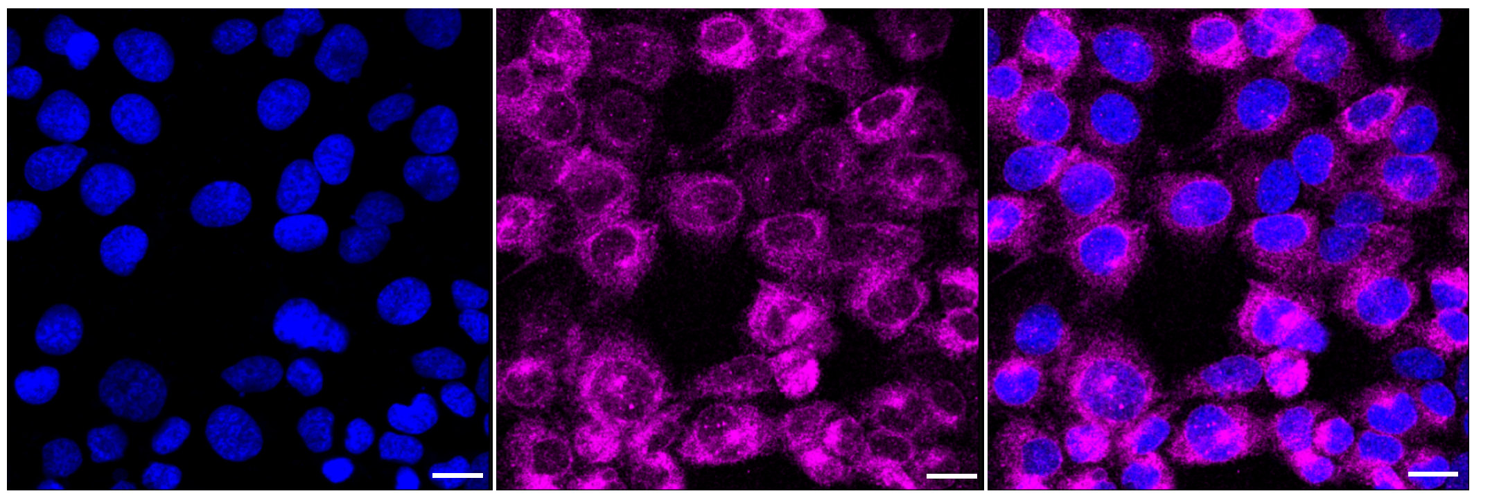 Immunocytochemical staining of HT-1080 cells with TMEM173 antibody. Nuclei were stained blue with DAPI; TMEM173 was stained magenta with Alexa Fluor? 647. Images were taken using Leica stellaris 5. Protein abundance based on laser Intensity and smart gain: Medium. Scale bar: 20 μm.