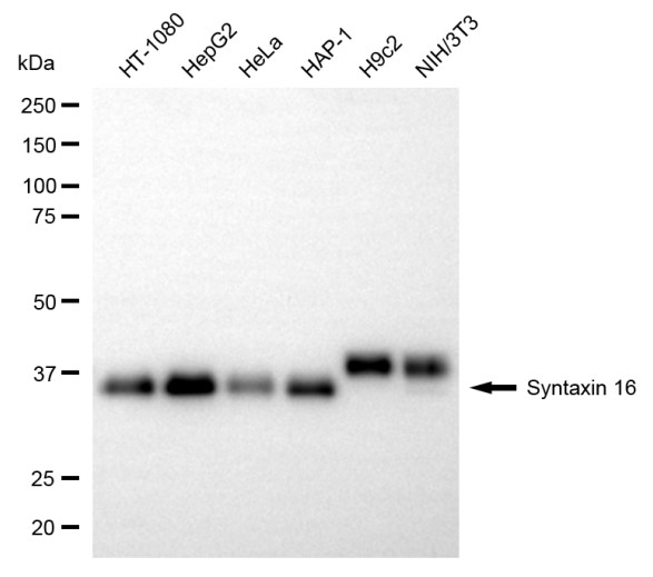 Western blotting analysis using syntaxin 16 antibody. Total cell lysates (30 μg) from various cell lines were loaded and separated by SDS-PAGE. The blot was incubated with syntaxin 16 antibody and HRP-conjugated goat anti-rabbit secondary antibody respectively.