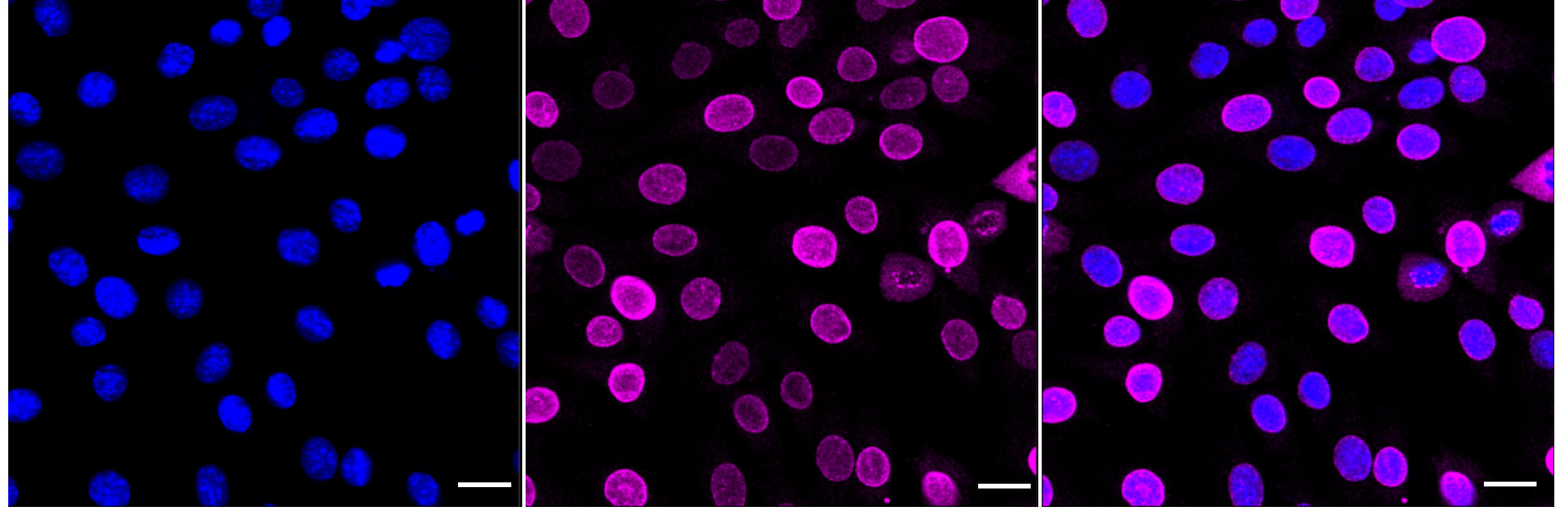 Immunocytochemical staining of C2C12 cells with SUN2 antibody. Nuclei were stained blue with DAPI; SUN2 was stained magenta with Alexa Fluor? 647. Images were taken using Leica stellaris 5. Protein abundance based on laser Intensity and smart gain: High. Scale bar: 20 μm.