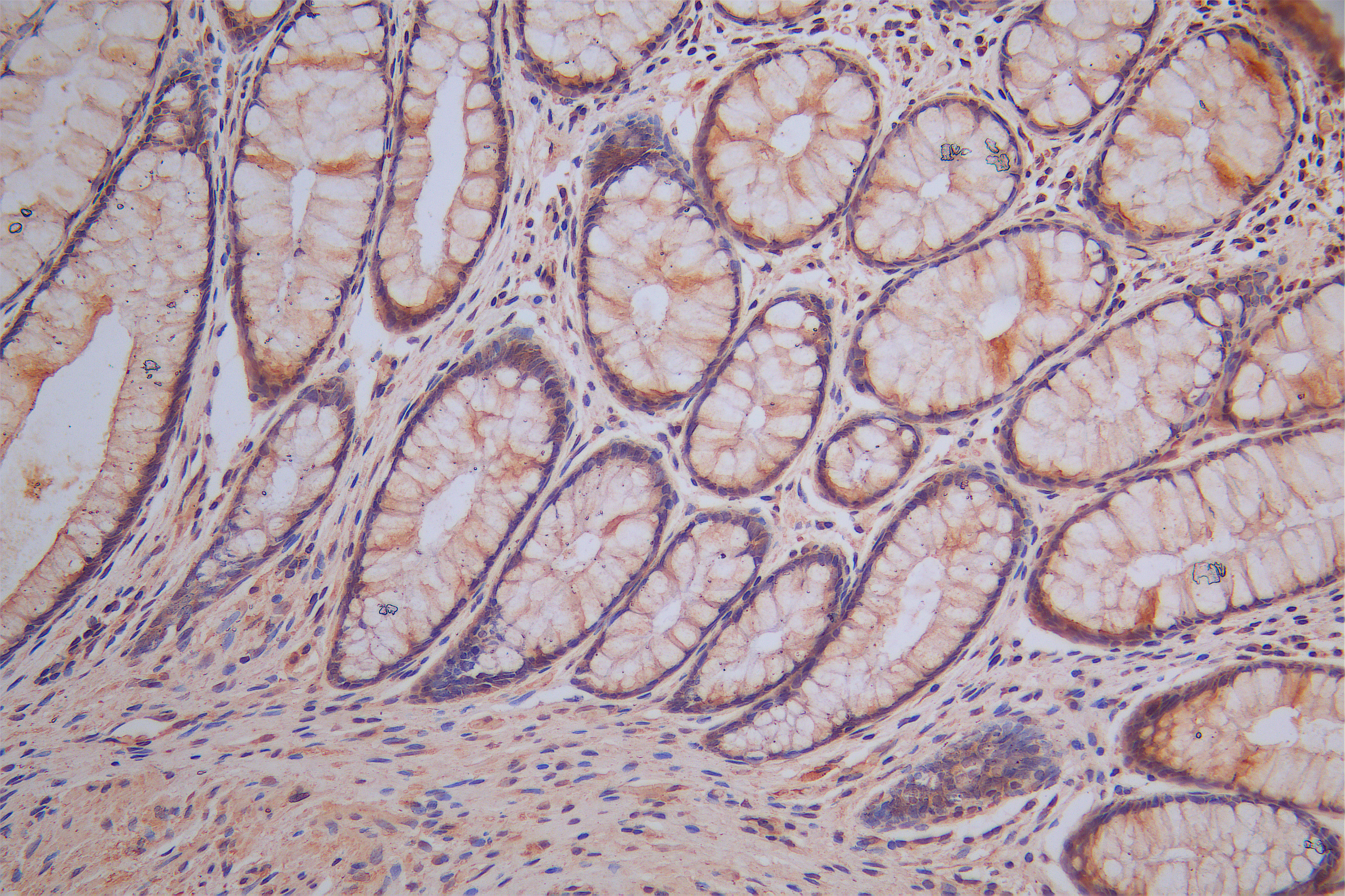 IHC image of CSB-RA023024MA1HU diluted at 1:200 and staining in paraffin-embedded human colorectal cancer performed on a Leica BondTM system. After dewaxing and hydration, antigen retrieval was mediated by high pressure in a citrate buffer (pH 6.0). Section was blocked with 10% normal goat serum 30min at RT. Then primary antibody (1% BSA) was incubated at 4°C overnight. The primary is detected by a Goat anti-Mouse IgG labeled by HRP and visualized using 0.05% DAB.