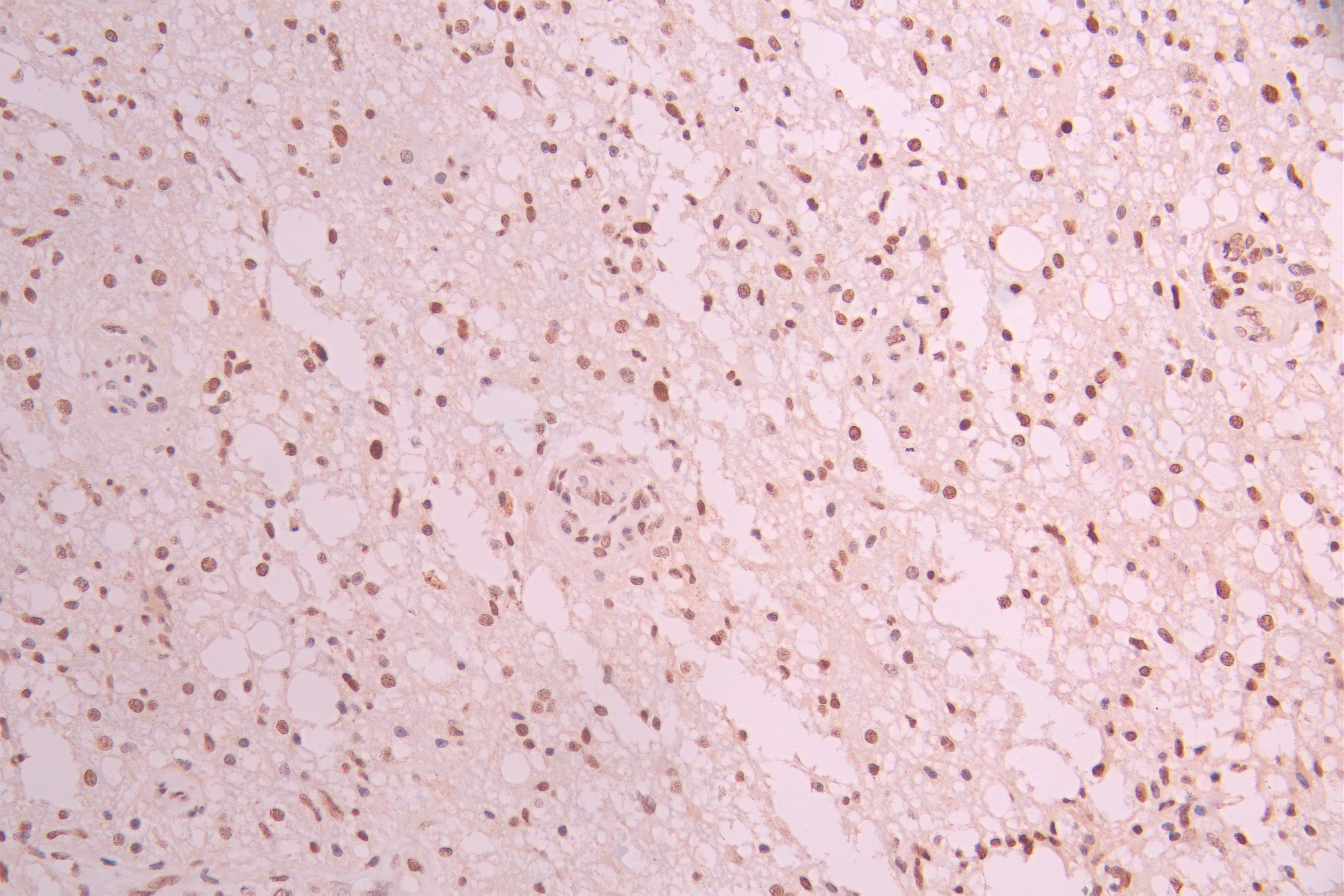 IHC image of CSB-RA778009A0HU diluted at 1:100 and staining in paraffin-embedded human glioma cancer performed on a Leica BondTM system. After dewaxing and hydration, antigen retrieval was mediated by high pressure in a citrate buffer (pH 6.0). Section was blocked with 10% normal goat serum 30min at RT. Then primary antibody (1% BSA) was incubated at 4°C overnight. The primary is detected by a Goat anti-rabbit polymer IgG labeled by HRP and visualized using 0.05% DAB.