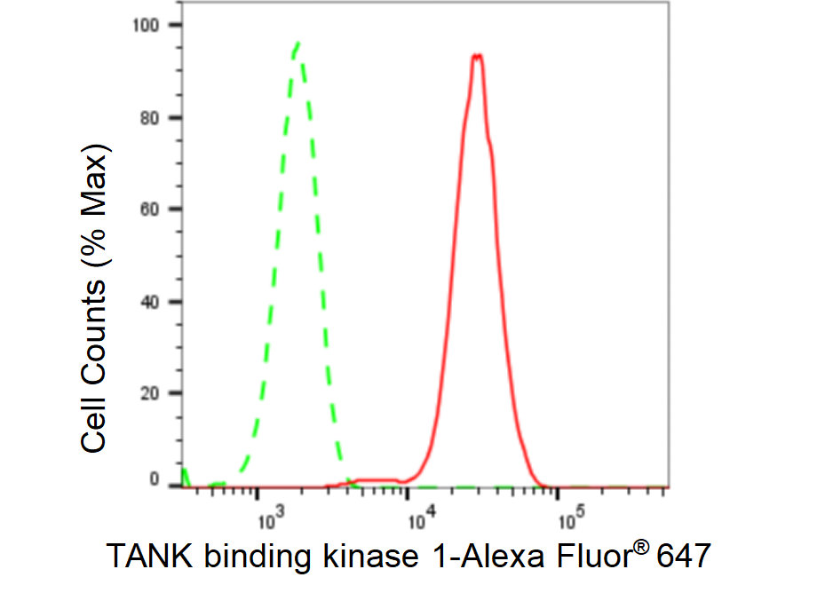 • Flow cytometric analysis of TANK binding kinase 1 expression in HepG2 cells using TANK binding kinase 1 antibody. Green, isotype control; red, TANK binding kinase 1.