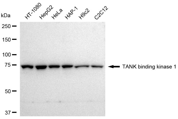 • Western blotting analysis using TANK binding kinase 1 antibody. Total cell lysates (30 μg) from various cell lines were loaded and separated by SDS-PAGE. The blot was incubated with TANK binding kinase 1 antibody and HRP-conjugated goat anti-rabbit secondary antibody respectively.