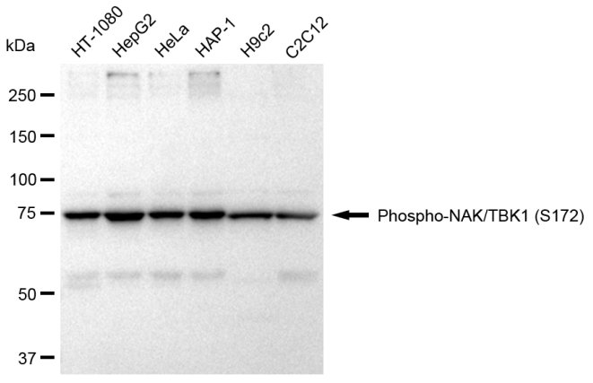 Western blotting analysis using Phospho-NAK/TBK1 (S172) antibody. Total cell lysates (30 μg) from various cell lines were loaded and separated by SDS-PAGE. The blot was incubated with Phospho-NAK/TBK1 (S172) antibody and HRP-conjugated goat anti-rabbit secondary antibody respectively.