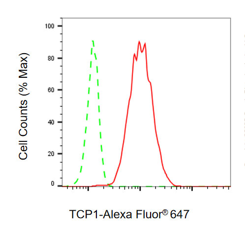 Flow cytometric analysis of TCP1 expression in HepG2 cells using TCP1 antibody. Green, isotype control; red, TCP1.