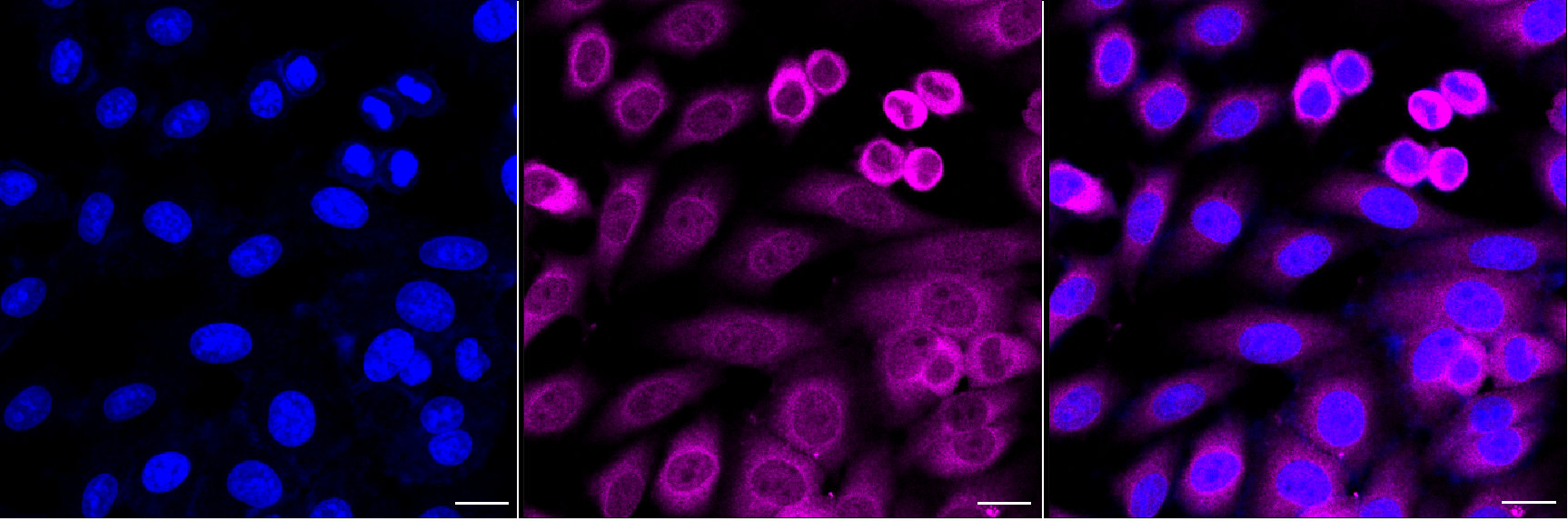 Immunocytochemical staining of HepG2 cells with TCP1 antibody. Nuclei were stained blue with DAPI; TCP1 was stained magenta with Alexa Fluor? 647. Images were taken using Leica stellaris 5. Protein abundance based on laser Intensity and smart gain: Medium. Scale bar, 20 μm.
