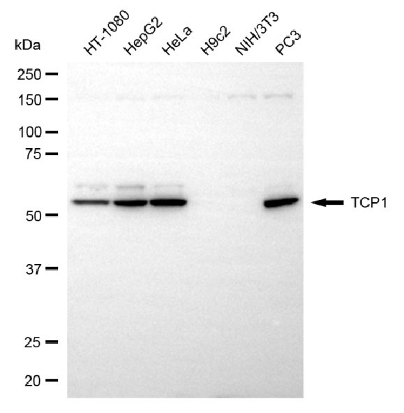 Western blotting analysis using TCP1 antibody. Total cell lysates (30 μg) from various cell lines were loaded and separated by SDS-PAGE. The blot was incubated with TCP1 antibody and HRP-conjugated goat anti-rabbit secondary antibody respectively.
