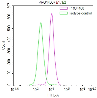 Overlay Peak curve showing HepG2 cells stained with CSB-RA023412MA1HU (red line) at 1:100. The cells were fixed in 4% formaldehyde and permeated by 0.2% TritonX-100 for 10min. Then 10% normal goat serum to block non-specific protein-protein interactions followed by the antibody (1ug/1*106cells) for 45min at 4℃. The secondary antibody used was Fluorescein (FITC) AffiniPure Goat Anti-Human IgG, Fcγ fragment specific at 1:200 dilution for 35 min at 4℃.Control antibody (green line) was human IgG1 (1ug/1*106cells) used under the same conditions. Acquisition of >10,000 events was performed.