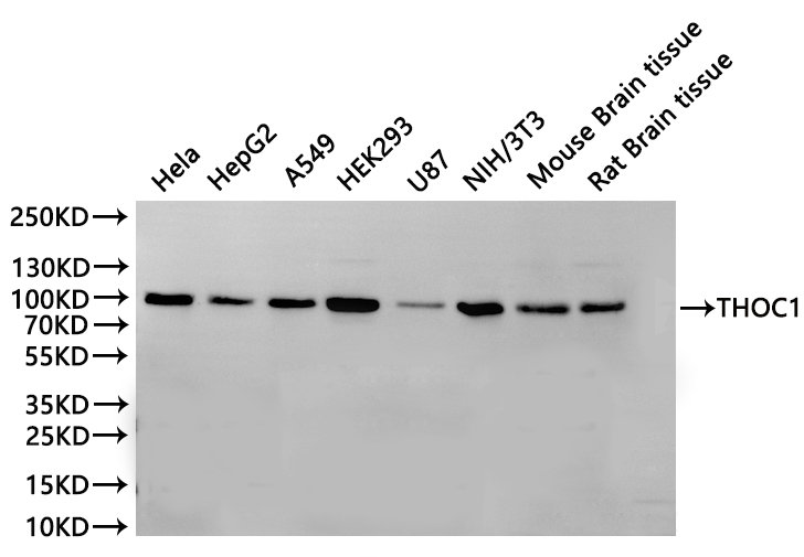 Positive WB detected in: Hela whole cell lysate(30μg), HepG2 whole cell lysate(30μg), A549 whole cell lysate(30μg), HEK293 whole cell lysate(30μg), U-87MG whole cell lysate(30μg), NIH/3T3 whole cell lysate(30μg), Mouse brain tissue lysate(30μg), Rat brain tissue lysate(30μg)