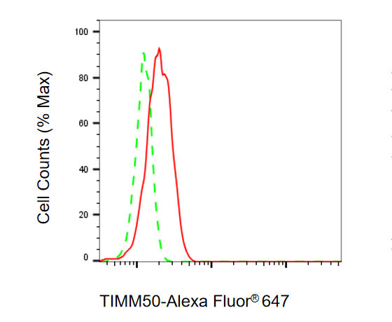 Flow cytometric analysis of TIMM50 expression in HepG2 cells using TIMM50 antibody. Green, isotype control; red, TIMM50.