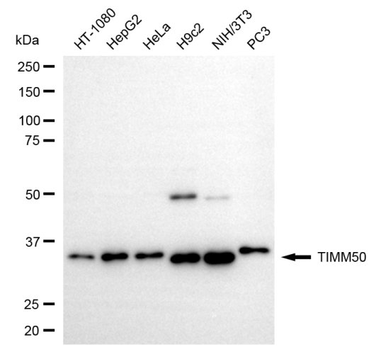 Western blotting analysis using TIMM50 antibody. Total cell lysates (30 μg) from various cell lines were loaded and separated by SDS-PAGE. The blot was incubated with TIMM50 antibody and HRP-conjugated goat anti-rabbit secondary antibody respectively.