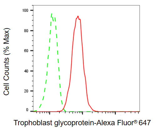 Flow cytometric analysis of trophoblast glycoprotein expression in HAP-1 cells using trophoblast glycoprotein antibody. Green, isotype control; red, trophoblast glycoprotein.