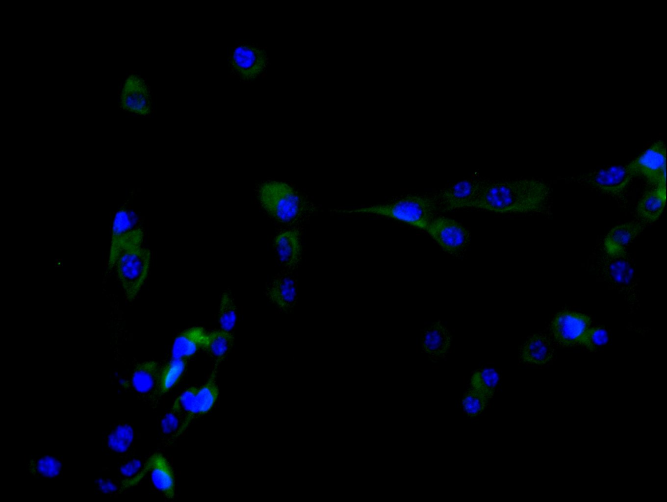 • Immunofluorescence staining of NIH/3T3 cell with CSB-RA024405MA5HU at 1:30 ,counter-stained with DAPI. The cells were fixed in 4% formaldehyde and blocked in 10% normal Goat Serum. The cells were then incubated with the antibody overnight at 4°C. The secondary antibody was Fluorescein (FITC) AffiniPure Goat Anti-Human IgG, Fcγ fragment specific.