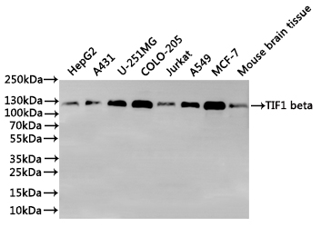 Positive WB detected in: HepG2 whole cell lysate(30μg), A431 whole cell lysate(30μg), U-251MG whole cell lysate(30μg), COLO-205 whole cell lysate(30μg), Jurkat whole cell lysate(30μg), A549 whole cell lysate(30μg), MCF-7 whole cell lysate(30μg), Mouse brain tissue lysate(30μg)