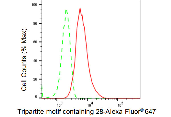 Flow cytometric analysis of Tripartite motif containing 28 expression in HT-1080 cells using Tripartite motif containing 28 antibody. Green, isotype control; red, Tripartite motif containing 28.