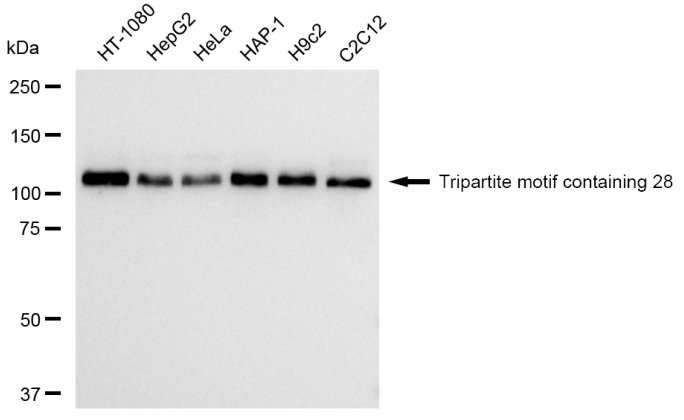 Western blotting analysis using Tripartite motif containing 28 antibody. Total cell lysates (30 μg) from various cell lines were loaded and separated by SDS-PAGE. The blot was incubated with Tripartite motif containing 28 antibody and HRP-conjugated goat rabbit secondary antibody respectively.
