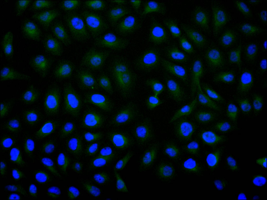 • Immunofluorescence staining of Hela cell with CSB-RA048528A0HU at 1:50, counter-stained with DAPI. The cells were fixed in 4% formaldehyde, permeabilized using 0.2% Triton X-100 and blocked in 10% normal Goat Serum. The cells were then incubated with the antibody overnight at 4°C. The secondary antibody was Alexa Fluor 488-congugated AffiniPure Goat Anti-Rabbit IgG(H+L).