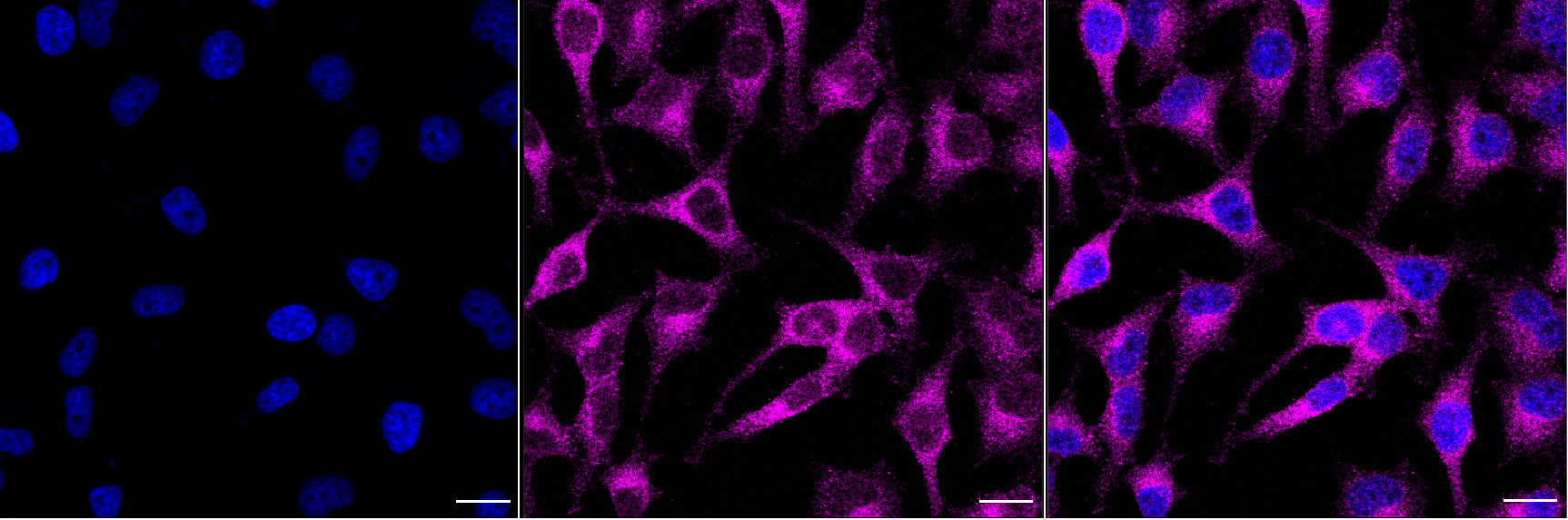 Immunocytochemical staining of HeLa cells with tuberin antibody. Nuclei were stained blue with DAPI; Tuberin was stained magenta with Alexa Fluor? 647. Images were taken using Leica stellaris 5. Protein abundance based on laser Intensity and smart gain: Medium. Scale bar, 20 μm.