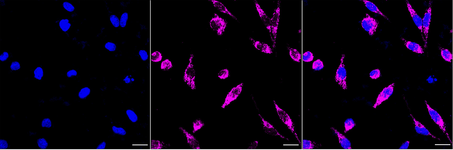 Immunocytochemical staining of HeLa cells with TSFM antibody. Nuclei were stained blue with DAPI; TSFM was stained magenta with Alexa Fluor? 647. Images were taken using Leica stellaris 5. Protein abundance based on laser Intensity and smart gain: Medium. Scale bar, 20 μm.