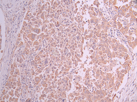 IHC image of CSB-RA053471A0HU diluted at 1:100 and staining in paraffin-embedded human liver cancer performed on a Leica BondTM system. After dewaxing and hydration, antigen retrieval was mediated by high pressure in a citrate buffer (pH 6.0). Section was blocked with 10% normal goat serum 30min at RT. Then primary antibody (1% BSA) was incubated at 4°C overnight. The primary is detected by a Goat anti-rabbit polymer IgG labeled by HRP and visualized using 0.05% DAB.