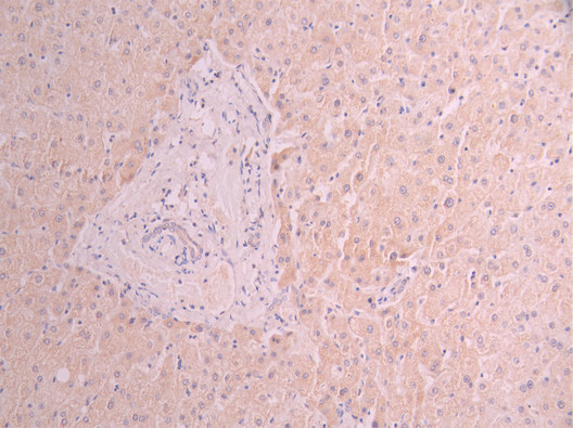IHC image of CSB-RA053471A0HU diluted at 1:100 and staining in paraffin-embedded human liver tissue performed on a Leica BondTM system. After dewaxing and hydration, antigen retrieval was mediated by high pressure in a citrate buffer (pH 6.0). Section was blocked with 10% normal goat serum 30min at RT. Then primary antibody (1% BSA) was incubated at 4°C overnight. The primary is detected by a Goat anti-rabbit polymer IgG labeled by HRP and visualized using 0.05% DAB.