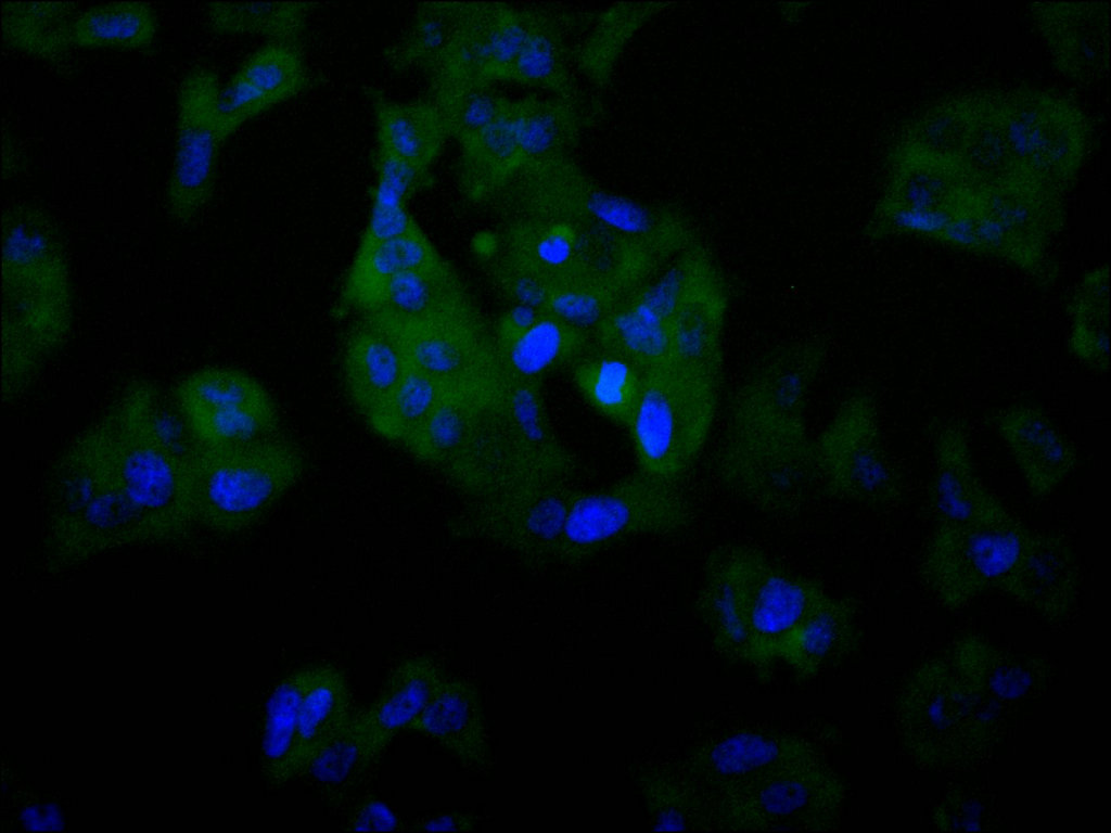 Immunofluorescence staining of MCF-7 cell with CSB-RA786302A0HU at 1:50, counter-stained with DAPI. The cells were fixed in 4% formaldehyde, permeabilized using 0.2% Triton X-100 and blocked in 10% normal Goat Serum. The cells were then incubated with the antibody overnight at 4°C. The secondary antibody was Alexa Fluor 488-congugated AffiniPure Goat Anti-Rabbit IgG(H+L).