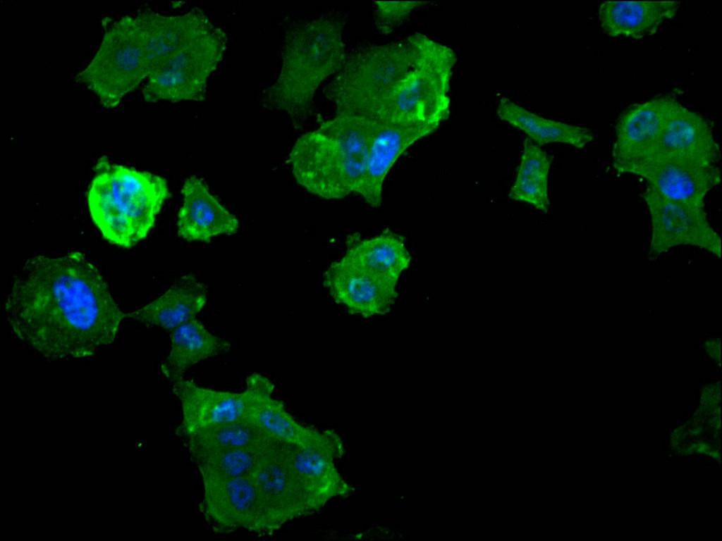 • Immunofluorescence staining of MCF-7 cell with CSB-RA036685A0HU at 1:50, counter-stained with DAPI. The cells were fixed in 4% formaldehyde, permeabilized using 0.2% Triton X-100 and blocked in 10% normal Goat Serum. The cells were then incubated with the antibody overnight at 4°C. The secondary antibody was Alexa Fluor 488-congugated AffiniPure Goat Anti-Rabbit IgG(H+L).