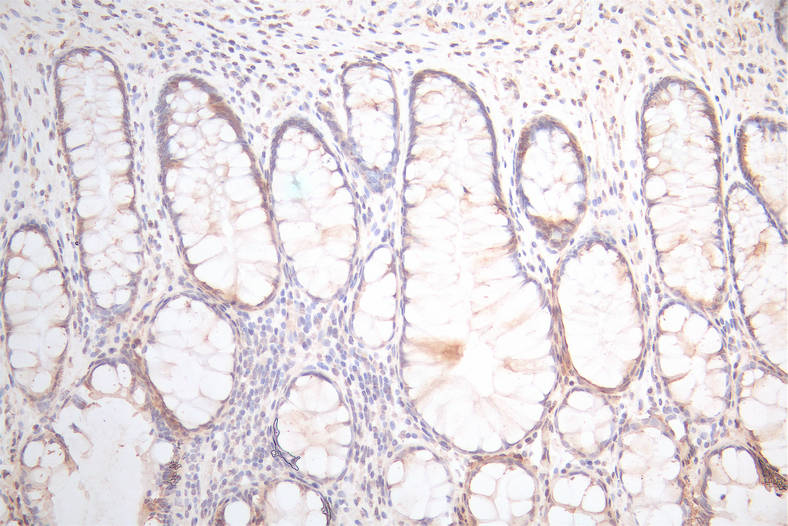 IHC image of CSB-RA025440MA1HU diluted at 1:300 and staining in paraffin-embedded human colorectal cancer performed on a Leica BondTM system. After dewaxing and hydration, antigen retrieval was mediated by high pressure in a citrate buffer (pH 6.0). Section was blocked with 10% normal goat serum 30min at RT. Then primary antibody (1% BSA) was incubated at 4°C overnight. The primary is detected by a Goat anti-Mouse IgG labeled by HRP and visualized using 0.05% DAB.
