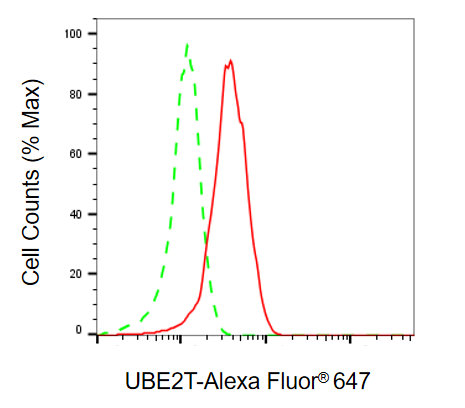 Flow cytometric analysis of UBE2T expression in HepG2 cells using UBE2T antibody. Green, isotype control; red, UBE2T.