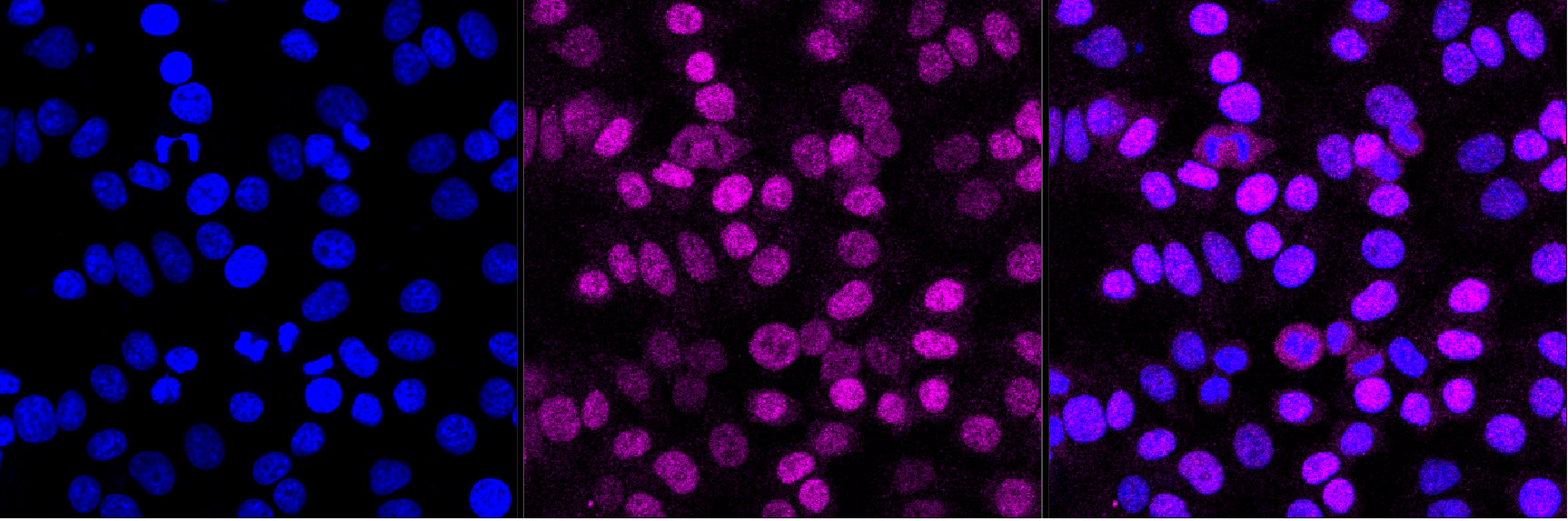 Immunocytochemical staining of HepG2 cells with UBE2T antibody. Nuclei were stained blue with DAPI; UBE2T was stained magenta with Alexa Fluor? 647. Images were taken using Leica stellaris 5. Protein abundance based on laser Intensity and smart gain: Medium. Scale bar, 20 μm.