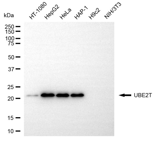 Western blotting analysis using UBE2T antibody. Total cell lysates (30 μg) from various cell lines were loaded and separated by SDS-PAGE. The blot was incubated with UBE2T antibody and HRP-conjugated goat anti-rabbit secondary antibody respectively.