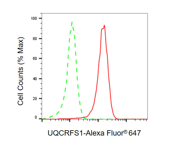 Flow cytometric analysis of UQCRFS1 expression in HepG2 cells using UQCRFS1 antibody. Green, isotype control; red, UQCRFS1.