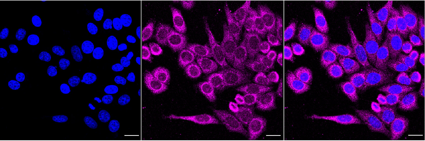 Immunocytochemical staining of HepG2 cells with UQCRFS1 antibody. Nuclei were stained blue with DAPI; UQCRFS1 was stained magenta with Alexa Fluor? 647. Images were taken using Leica stellaris 5. Protein abundance based on laser Intensity and smart gain: Medium. Scale bar, 20 μm.