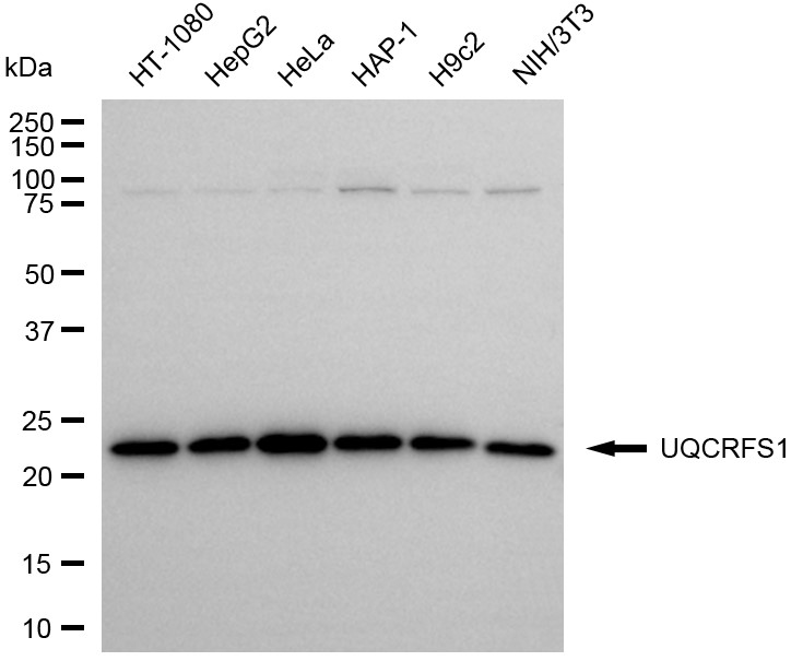 Western blotting analysis using UQCRFS1 antibody. Total cell lysates (30 μg) from various cell lines were loaded and separated by SDS-PAGE. The blot was incubated with UQCRFS1 antibody and HRP-conjugated goat anti-rabbit secondary antibody respectively.