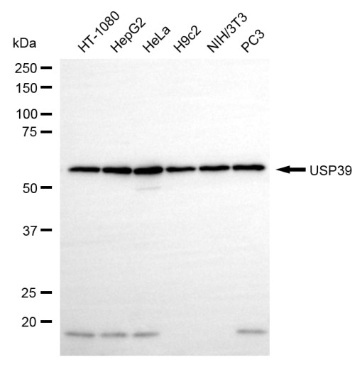 Western blotting analysis using USP39 antibody. Total cell lysates (30 μg) from various cell lines were loaded and separated by SDS-PAGE. The blot was incubated with USP39 antibody and HRP-conjugated goat anti-rabbit secondary antibody respectively.