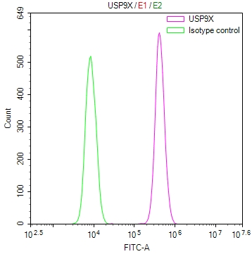 Overlay Peak curve showing Hela cells stained with CSB-RA183712A0HU (red line) at 1:100. The cells were fixed in 4% formaldehyde and permeated by 0.2% TritonX-100 for 10min. Then 10% normal goat serum to block non-specific protein-protein interactions followed by the antibody (1ug/1*106cells) for 45min at 4℃. The secondary antibody used was FITC-conjugated goat anti-rabbit IgG (H+L) at 1/200 dilution for 35min at 4℃.Control antibody (green line) was Rabbit IgG (1ug/1*106cells) used under the same conditions. Acquisition of >10,000 events was performed.