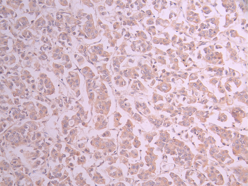 IHC image of CSB-RA183712A0HU diluted at 1:100 and staining in paraffin-embedded human breast cancer performed on a Leica BondTM system. After dewaxing and hydration, antigen retrieval was mediated by high pressure in a citrate buffer (pH 6.0). Section was blocked with 10% normal goat serum 30min at RT. Then primary antibody (1% BSA) was incubated at 4°C overnight. The primary is detected by a Goat anti-rabbit polymer IgG labeled by HRP and visualized using 0.05% DAB.