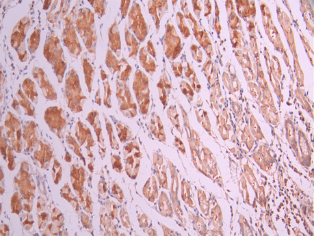 IHC image of CSB-RA183712A0HU diluted at 1:100 and staining in paraffin-embedded human stomach tissue performed on a Leica BondTM system. After dewaxing and hydration, antigen retrieval was mediated by high pressure in a citrate buffer (pH 6.0). Section was blocked with 10% normal goat serum 30min at RT. Then primary antibody (1% BSA) was incubated at 4°C overnight. The primary is detected by a Goat anti-rabbit polymer IgG labeled by HRP and visualized using 0.05% DAB.