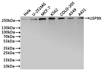 Positive WB detected in: Hela whole cell lysate(30μg), U-251MG whole cell lysate(30μg), MCF-7 whole cell lysate(30μg), K562 whole cell lysate(30μg), COLO-205 whole cell lysate(30μg), A549 whole cell lysate(30μg), A431 whole cell lysate(30μg)