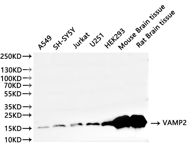 Positive WB detected in: A549 whole cell lysate(30μg), SH-SY5Y whole cell lysate(30μg), Jurkat whole cell lysate(30μg), U-251MG whole cell lysate(30μg), HEK293 whole cell lysate(30μg), Mouse brain tissue lysate(30μg), Rat brain tissue lysate(30μg)