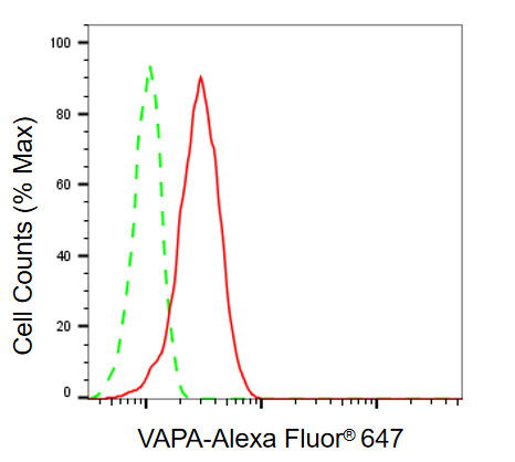 Flow cytometric analysis of VAPA expression in HepG2 cells using VAPA antibody. Green, isotype control; red, VAPA.