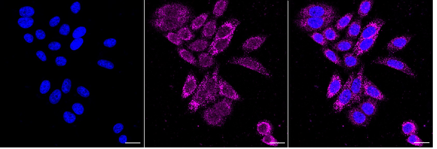 Immunocytochemical staining of HepG2 cells with VAPA antibody. Nuclei were stained blue with DAPI; VAPA was stained magenta with Alexa Fluor? 647. Images were taken using Leica stellaris 5. Protein abundance based on laser Intensity and smart gain: Medium. Scale bar, 20 μm.