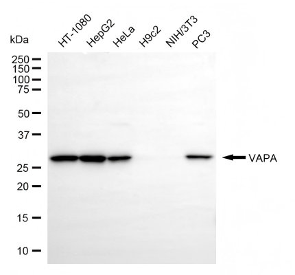 Western blotting analysis using VAPA antibody. Total cell lysates (30 μg) from various cell lines were loaded and separated by SDS-PAGE. The blot was incubated with VAPA antibody and HRP-conjugated goat anti-rabbit secondary antibody respectively.
